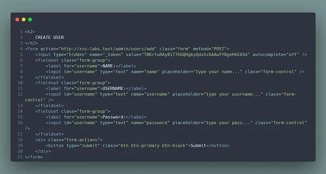 The provided script is straightforward JavaScript code. It sends a request to http://xss-labs.test/admin/users. Upon successful execution, it forwards the HTML content to https://myezxss.domain/assets/logs/receiver.php, which I’ve previously set up. The file receiver.php is a basic PHP file that receives the POST request and saves the data to an HTML file, allowing me to view and read the content.